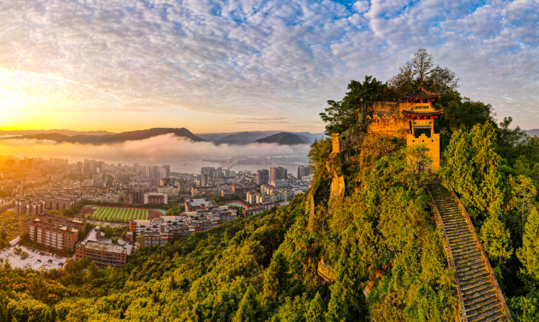 全长1400余米的登云梯如巨龙跃江,沿着1999级石阶拾级而上,登顶磐石城遗址,360度无遮挡江景与群山远景尽收眼底。双井寨的古寨门、养龙先生的传说、高祖阁的汉韵、橘官堂的橘香、“天下第一联”的墨宝、诗文长廊的雅韵,步步皆景,步步皆史。