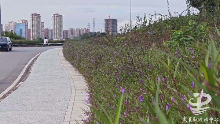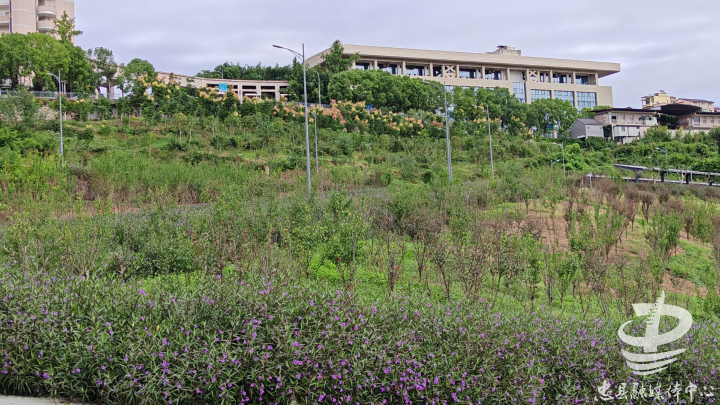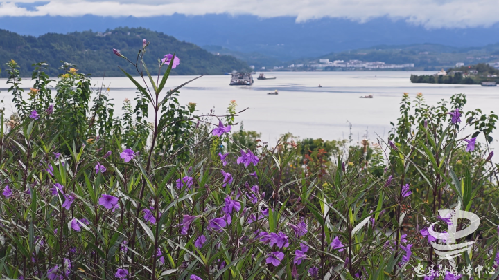 在临江公园,成片的蓝花草绽放,层层叠叠的花朵错落有致,与同期绽放的栾树花相互映衬。远眺之下,这片紫色花丛与现代城市建筑、雄伟的忠县长江大桥以及江面往来的船只相映成趣,构成一幅自然与城市交融的生态画卷。