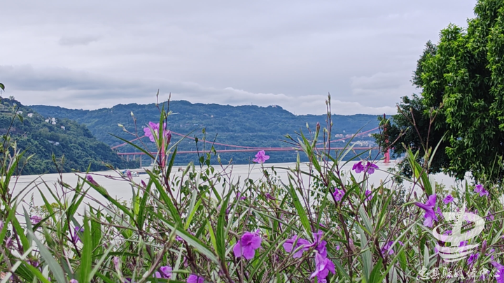 紫色花丛与忠县长江大桥交相辉映。记者 周晶 摄