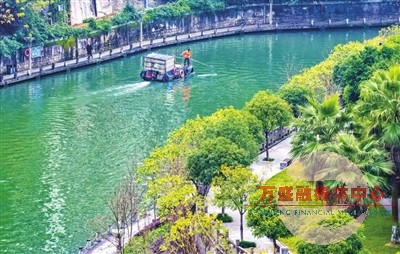 近日,孝子河城区段,工作人员驾驶河道保洁船边巡查边打捞水面漂浮物,守护万盛的“母亲河”。