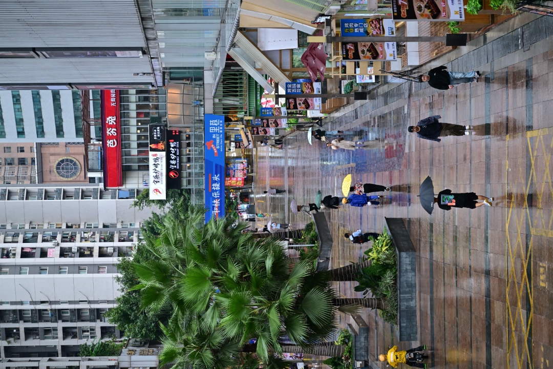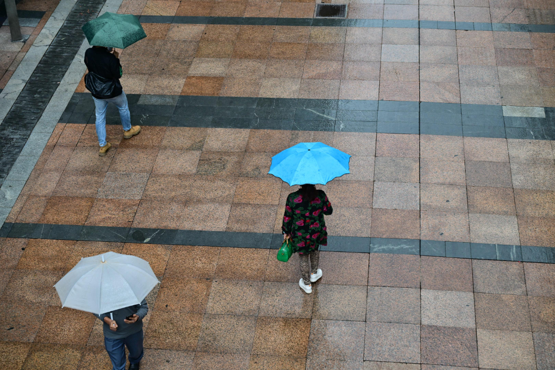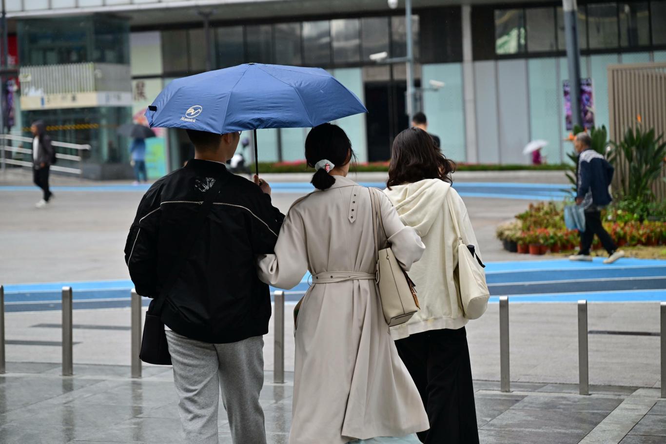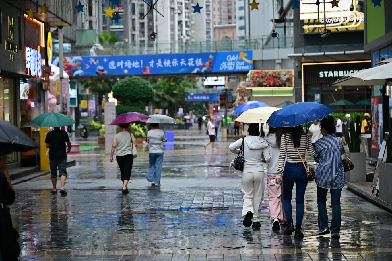 10月13日,南岸区万达广场,市民们在雨中行走,突如其来的降温,市民们纷纷穿上了长衣长裤进行保暖。这周的重庆天气,完美诠释了什么叫做“换季式降温”!上周“超长待机”夏天,30+℃的高温。昨晚降雨过后,20+℃的舒爽气温让人忍不住翻出久违的外套,这种“一周过两季”的急速转变,很魔幻也很重庆。