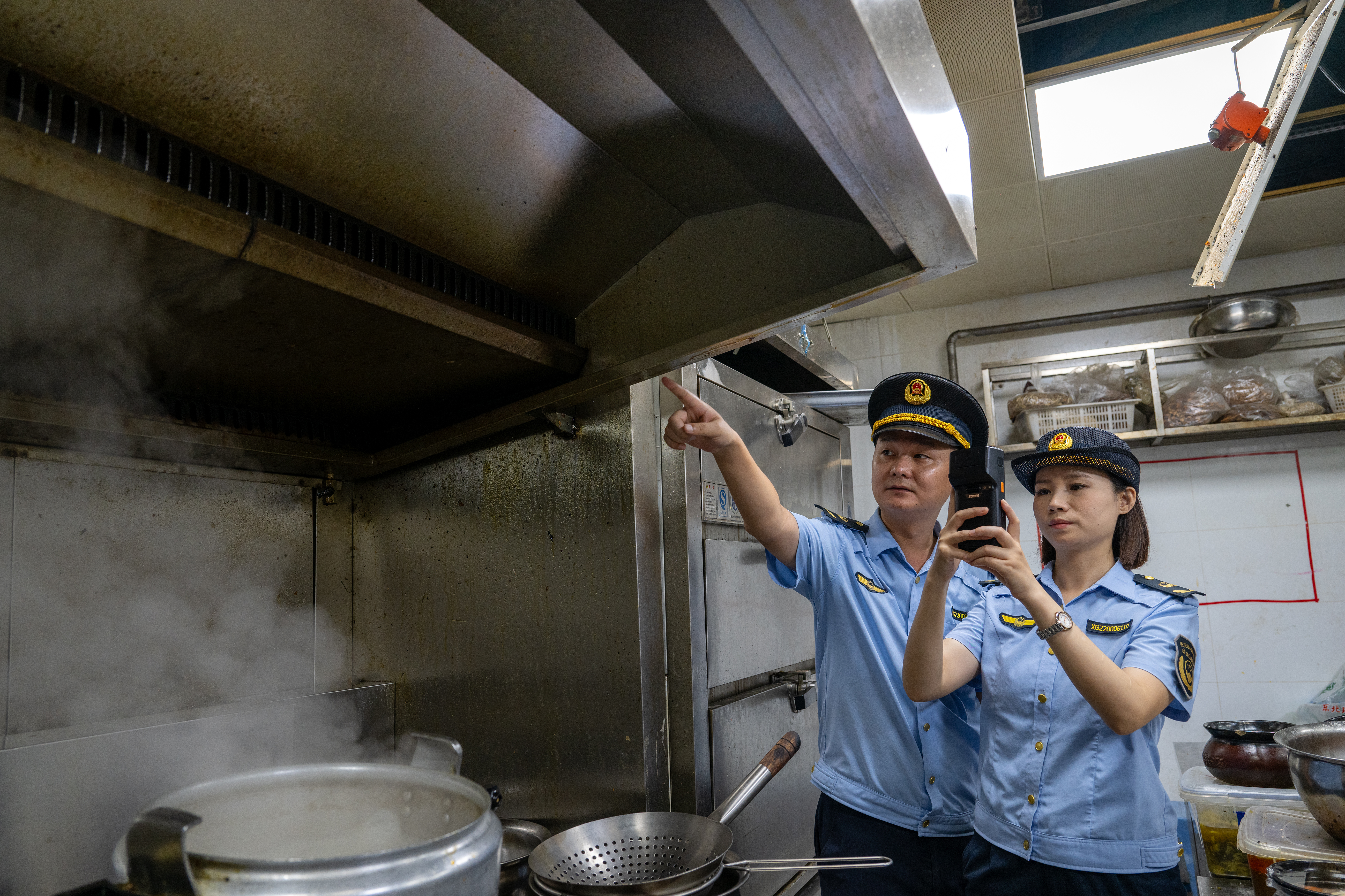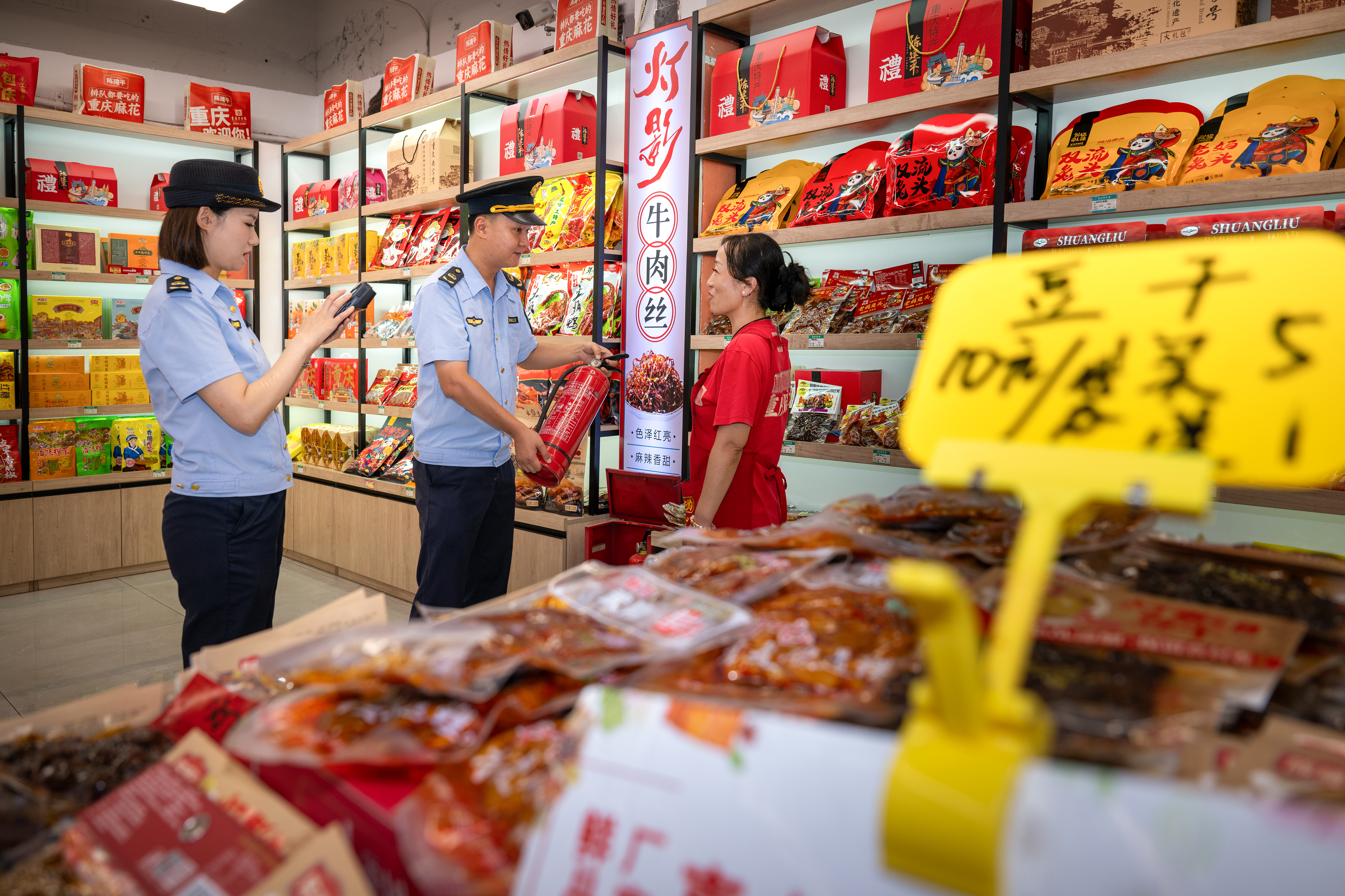 ▲2025年10月17日,沙坪坝磁器口古镇商户内,,磁器口街道综合行政执法队员对照“综合查一次”清单,逐项进行核查。记者 张春晓 摄