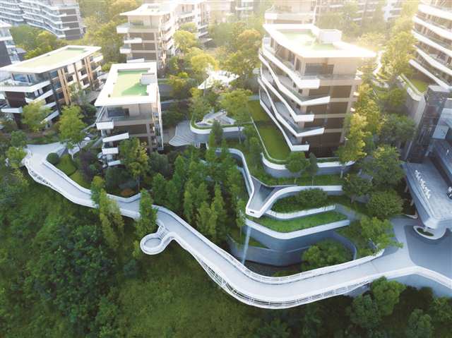核心景观“飞鸟集”更是社区的“颜值担当”——约40亩的十字中庭景观轴贯穿其中,漩涡峡谷里31141株热带植物簇拥成林,仿佛一片微型热带雨林;螺旋塔由3000米艺术钢带编织而成,线条灵动飘逸,既是景观地标,也是业主打卡的“网红点”。分布在每个台地的宅间花园也都有专属主题,阳光草坪上能野餐嬉戏,廊架里满是孩子的欢闹,让景观不止“好看”更“好用”,实现人与自然的亲密对话。
