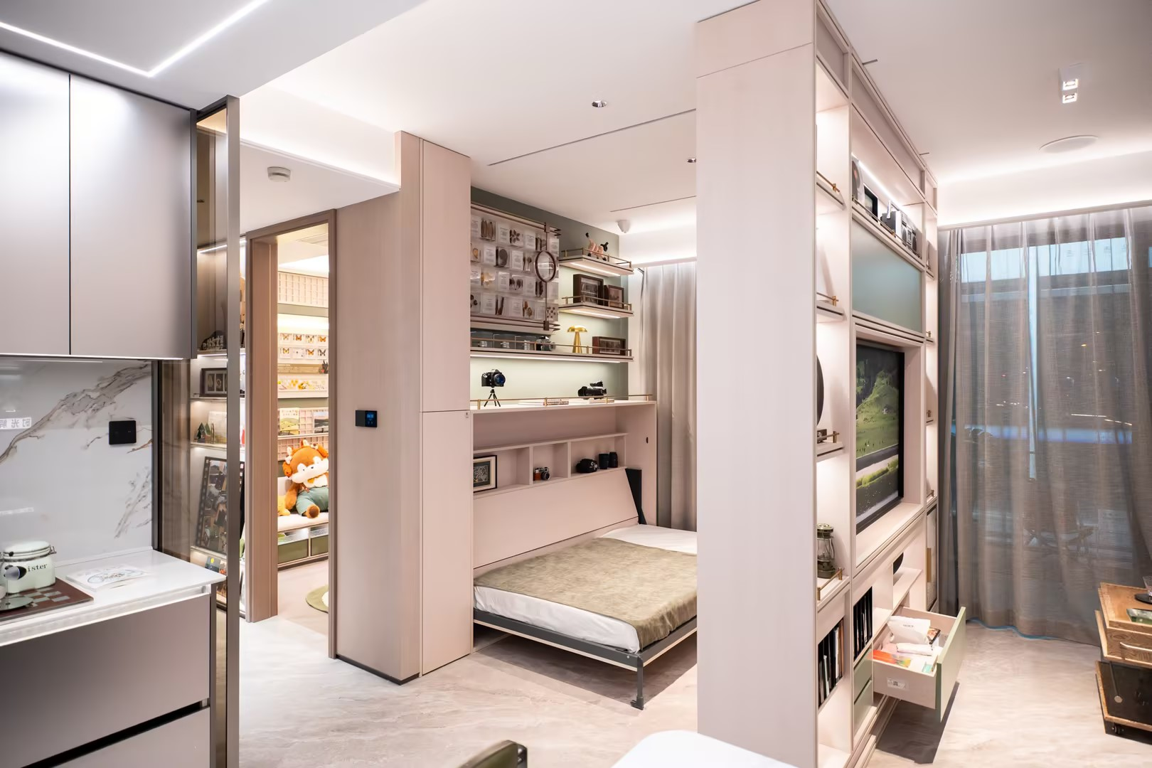 样板间内,联发以“小户型、大生活、高品质”作答。一键启动后,柜体平稳移动、床体缓缓下放,79平方米空间秒变3房1.9卫,引得参观者连连称奇。