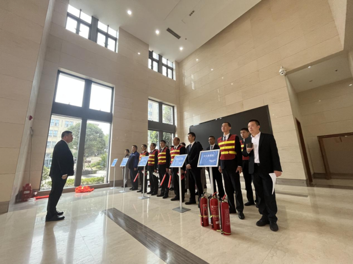 场景化演练,锤炼协同能力。 在金凤实验室项目,演练模拟特定实验环境火情,着重考验科研人员在紧急情况下的初期处置与有序疏散能力。金凤城市中心项目则针对高层建筑特点,模拟楼层火灾,重点演练利用疏散引导箱内专业器材(如荧光指挥棒、手持扩音器)进行大规模人员高效引导,仅用4分钟完成全员安全撤离,展现了精细化疏散组织水平。科创二期、西区孵化楼等项目演练均强调物业与企业应急力量的联动融合,检验了应急预案的可行性与指挥体系的畅通性。