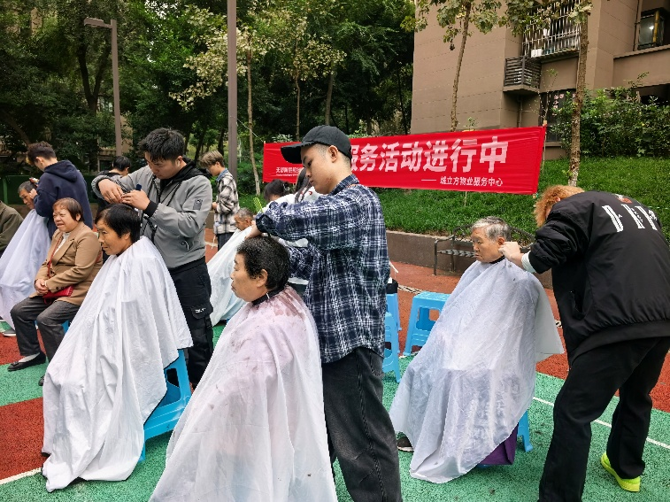 便民服务精准对接业主需求,每月定期开展剪头发、磨刀、洗地毯、健康义诊等服务。“我年纪大、腿脚不便,以前剪头发要麻烦子女,现在在家门口就能解决,医生还免费量血压、讲健康知识,太方便了。”业主张大爷满意地表示。