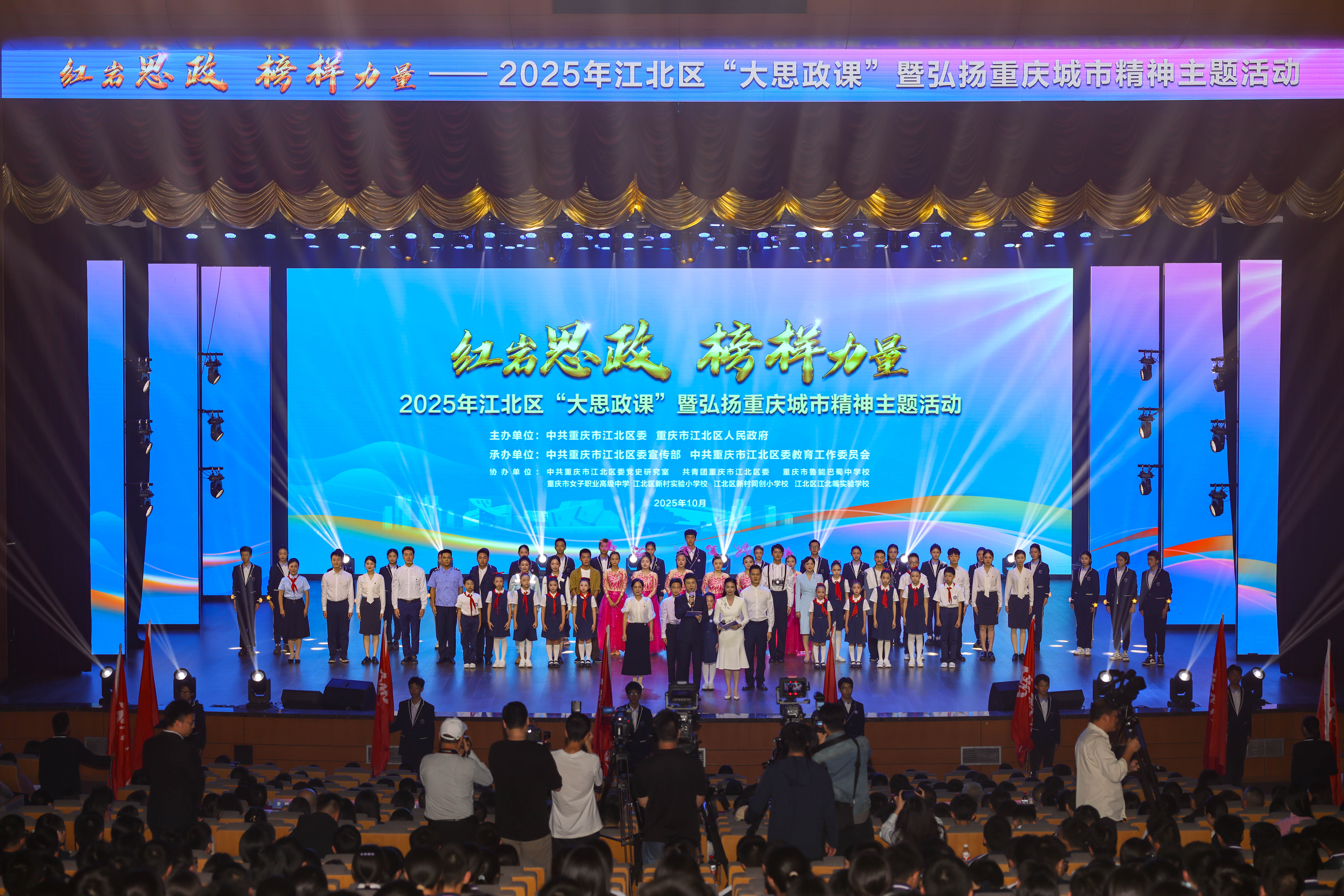 本次大思政课以“探寻江北历史印迹 感悟重庆城市精神”为主题,创新采用“情景演绎”舞台剧形式,生动呈现重庆人民从抗战岁月中的“坚韧”,到工业西迁所体现的“忠勇”,再到“新重庆 潮江北”展现的“开放”,以及新时代江北儿女奋发“争先”的精神图谱。现场观众在沉浸式体验中,深入感悟红岩精神的时代价值,进一步加深对重庆城市精神的理解。