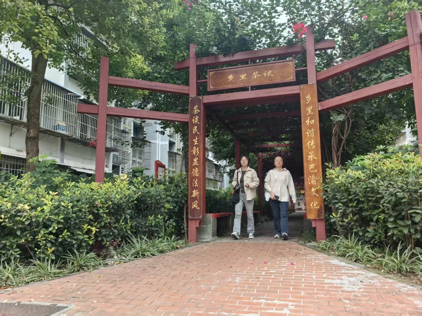 ▲修整后的绿色长廊既是休闲场地,也成为居民反馈意见和建议的“乡里茶谈”场地。记者 罗芸 摄