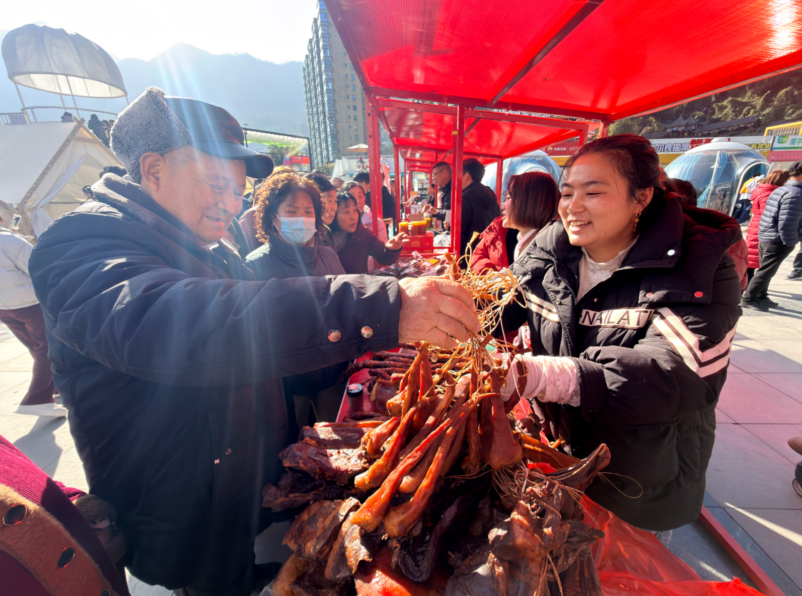 ▲12月25日下午,陕西省岚皋县岚皋广场上,城口土特产吸引了不少当地群众前来选购。记者 刘冲 摄