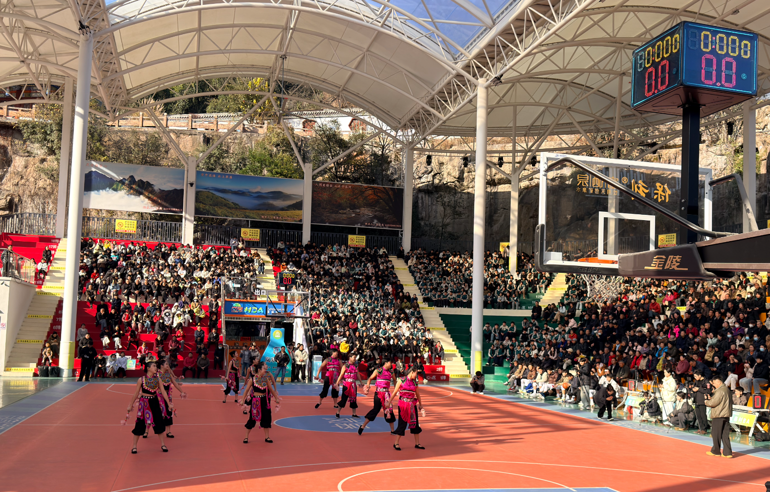 ▲12月25日下午,陕西省岚皋县“村BA”场馆内,城口的钱棍舞吸引了众多当地观众。记者 刘冲 摄