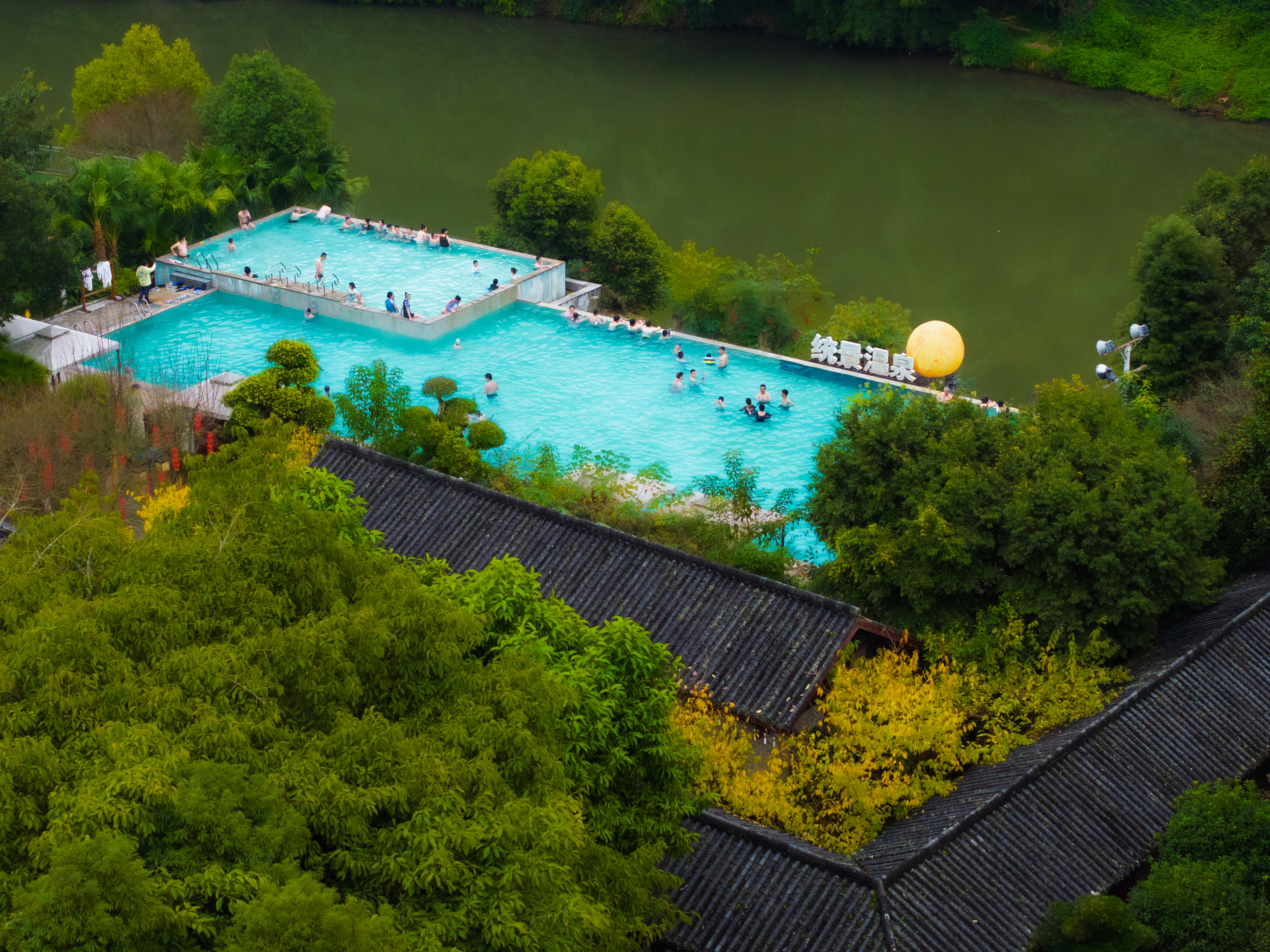 ▲北碚区统景温泉景区,市民和游客正在泡温泉(无人机照片)。(资料图片)记者 李雨恒 摄