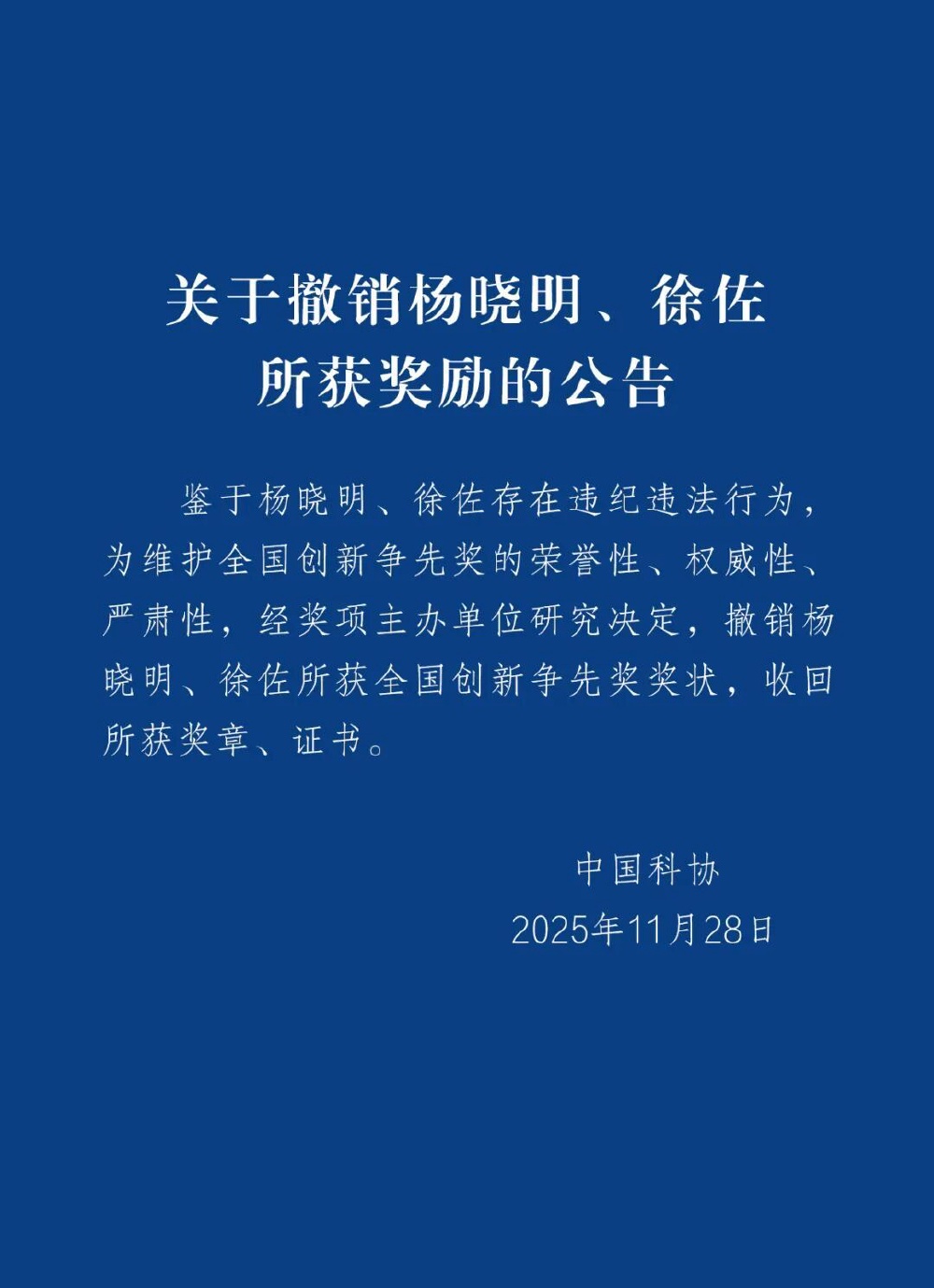 “中国科协之声”11月28日发布《关于撤销杨晓明、徐佐所获奖励的公告》。