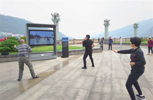 ▲ 市民在智慧广场Al屏前跟学太极拳