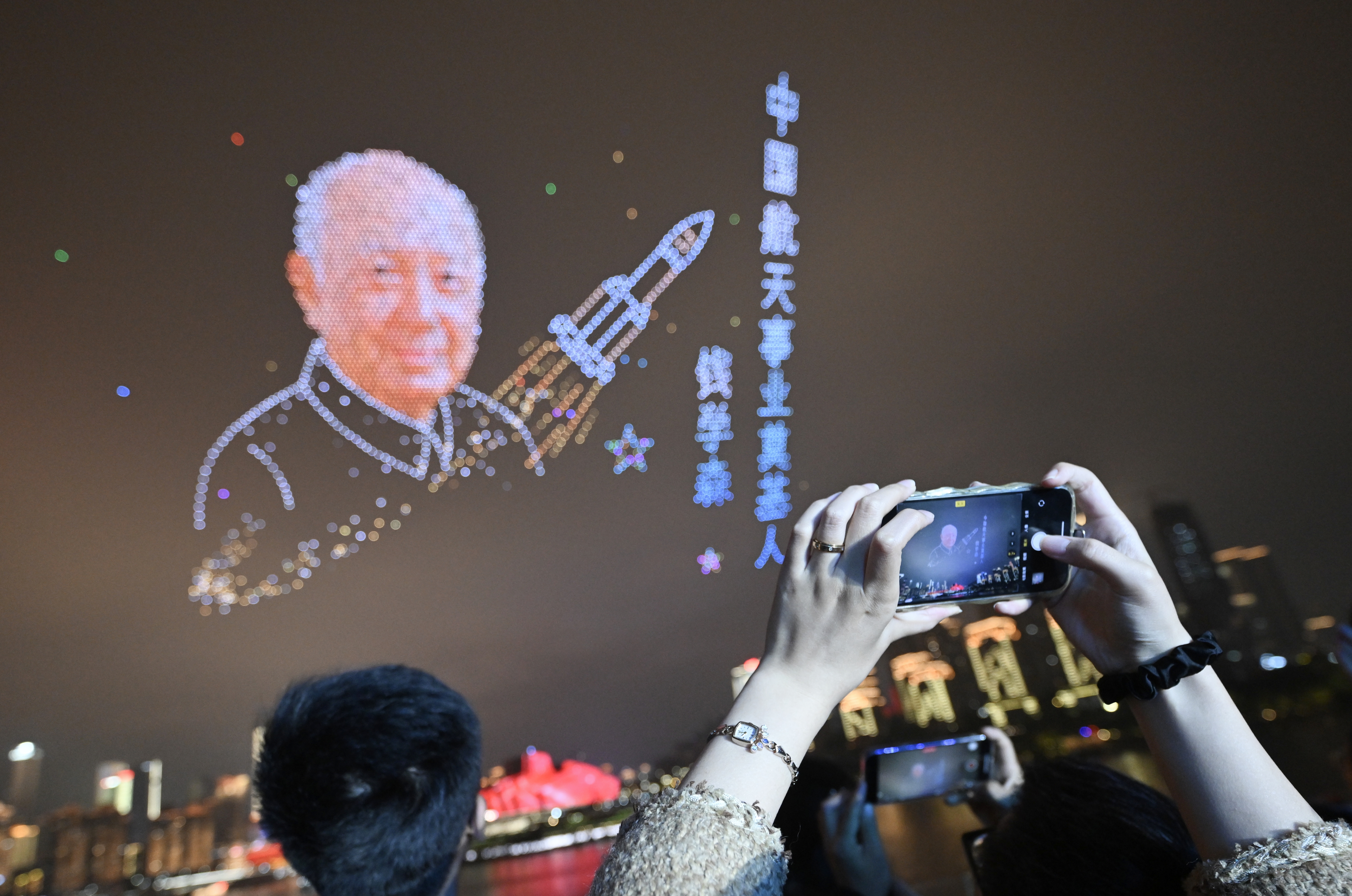 短暂的停歇后,一道火箭轨道的金光划过天幕,铸成钱学森先生的伟岸身影,他的身旁,文字“中国航天事业奠基人 钱学森”如星辰般璀璨,以此致敬这位民族脊梁、航天先驱;邓稼先先生坚毅的轮廓,在无人机灯光中被缓缓勾勒而出,旁边的文字“两弹元勋 邓稼先”字样熠熠生辉。致敬这位以身许国的时代巨星;星光为笔,在夜空中绘出一株株丰硕的金色稻穗,禾下光影间,袁隆平院士的身影巍然含笑,他的身旁出现“杂交水稻之父 袁隆平”的流光字样,此致敬这位从重庆走出的科学巨匠,以及他那毕生为民的赤子情怀。