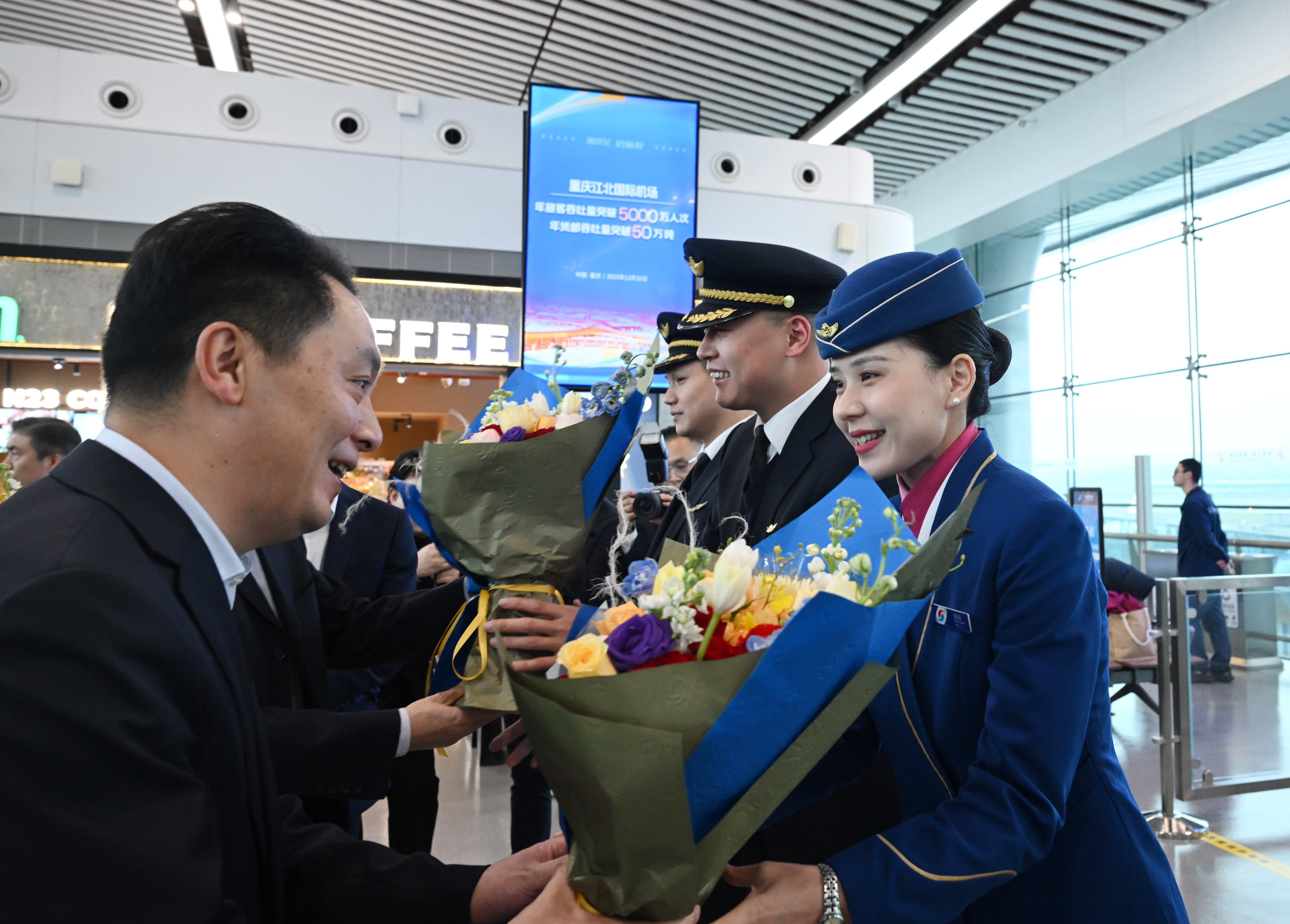 ▲2025年12月31日,重庆江北国际机场T3A航站楼内,航空公司的乘务员收到鲜花。 记者 罗斌 摄/视觉重庆