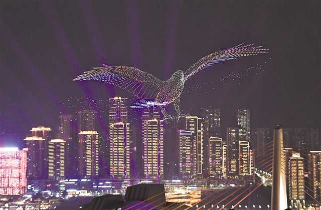 光影变化或为彩虹之门,或为奔腾骏马,无人机闪烁着彩光乘势而起,在夜空中变成巨手轻点魔法棒,瞬间,重庆地标来福士被点亮,为盛大的无人机表演拉开帷幕。