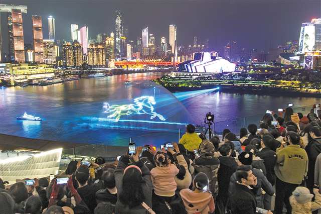 ▲2025年12月31日,南岸区南滨路,市民在观看精彩的水上灯光秀。记者 李雨恒 摄视觉重庆