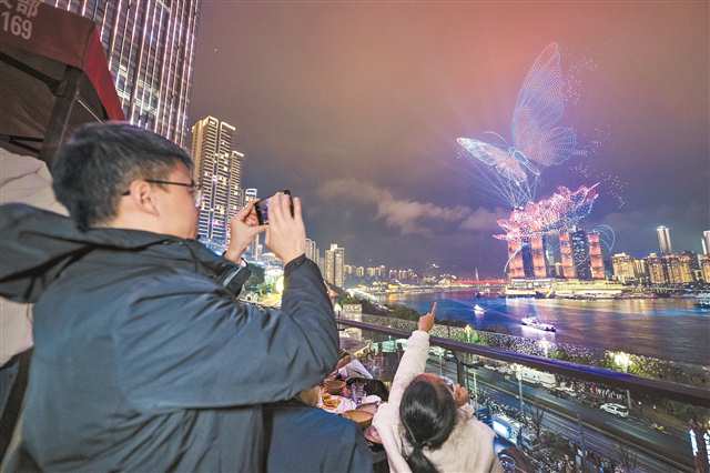▲1月1日,南岸区南滨路,市民欣赏无人机灯光秀跨年夜展演。记者 张春晓 摄/视觉重庆