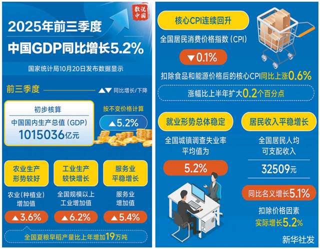 中国经济“三季报”20日最新出炉:前三季度,国内生产总值(GDP)1015036亿元,按不变价格计算,同比增长5.2%。其中,三季度增长4.8%。