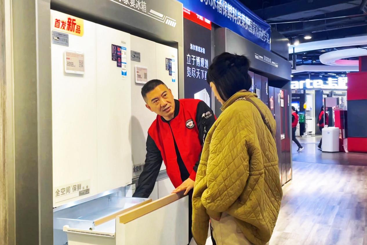 ▲两江新区京东超级体验店,工作人员正在为消费者讲解智能冰箱功能。受访单位供图