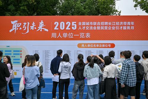 ▲10月16日,在2025年全国城市联合招聘长江经济带青年人才交流会暨民营企业引才服务月活动上,求职者积极了解招聘信息。记者 张春晓 摄