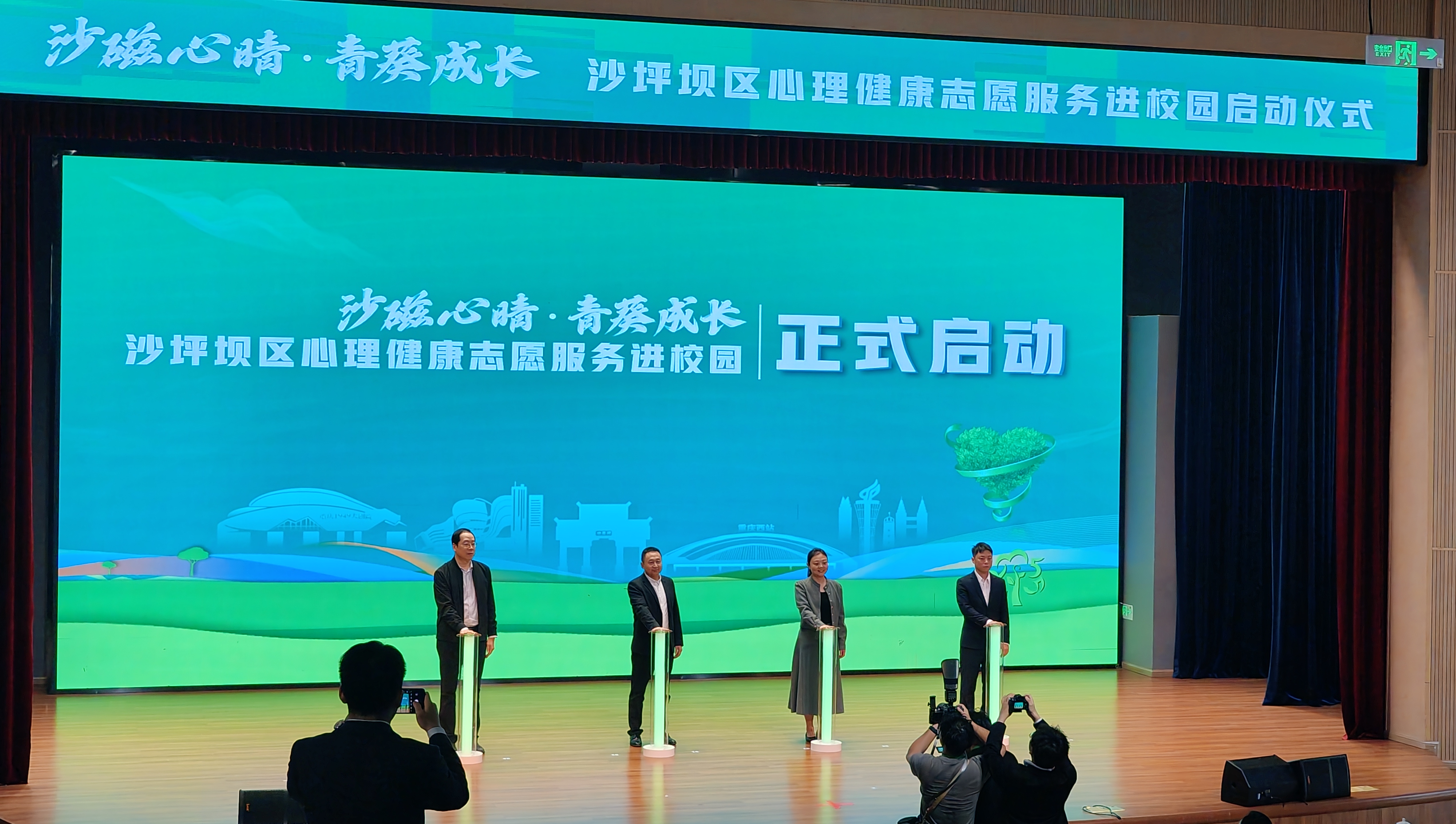 启动仪式现场,沙坪坝区教委、沙坪坝区团区委、中国人寿重庆市沙坪坝区支公司、广发银行重庆沙坪坝支行等4家单位共同点亮启动柱,正式宣告“沙磁心晴·青葵成长”沙坪坝区心理健康志愿服务进校园项目启动。重庆市12355青少年服务台区域中心站(沙坪坝)负责人现场发布《沙坪坝区心理健康志愿服务进校园服务清单》,该清单聚焦全区中小学学生、教师及家长群体的实际需求,明确将提供系统化、专业化、公益化的心理健康志愿服务,为青少年身心健康成长筑牢保障防线。此外,现场还为由12355区域中心站(沙坪坝)牵头组建的4支校园心理健康志愿服务队授旗。随后,由重庆师范大学教育科学学院带来校园心理剧展演、心理辅导讲座。