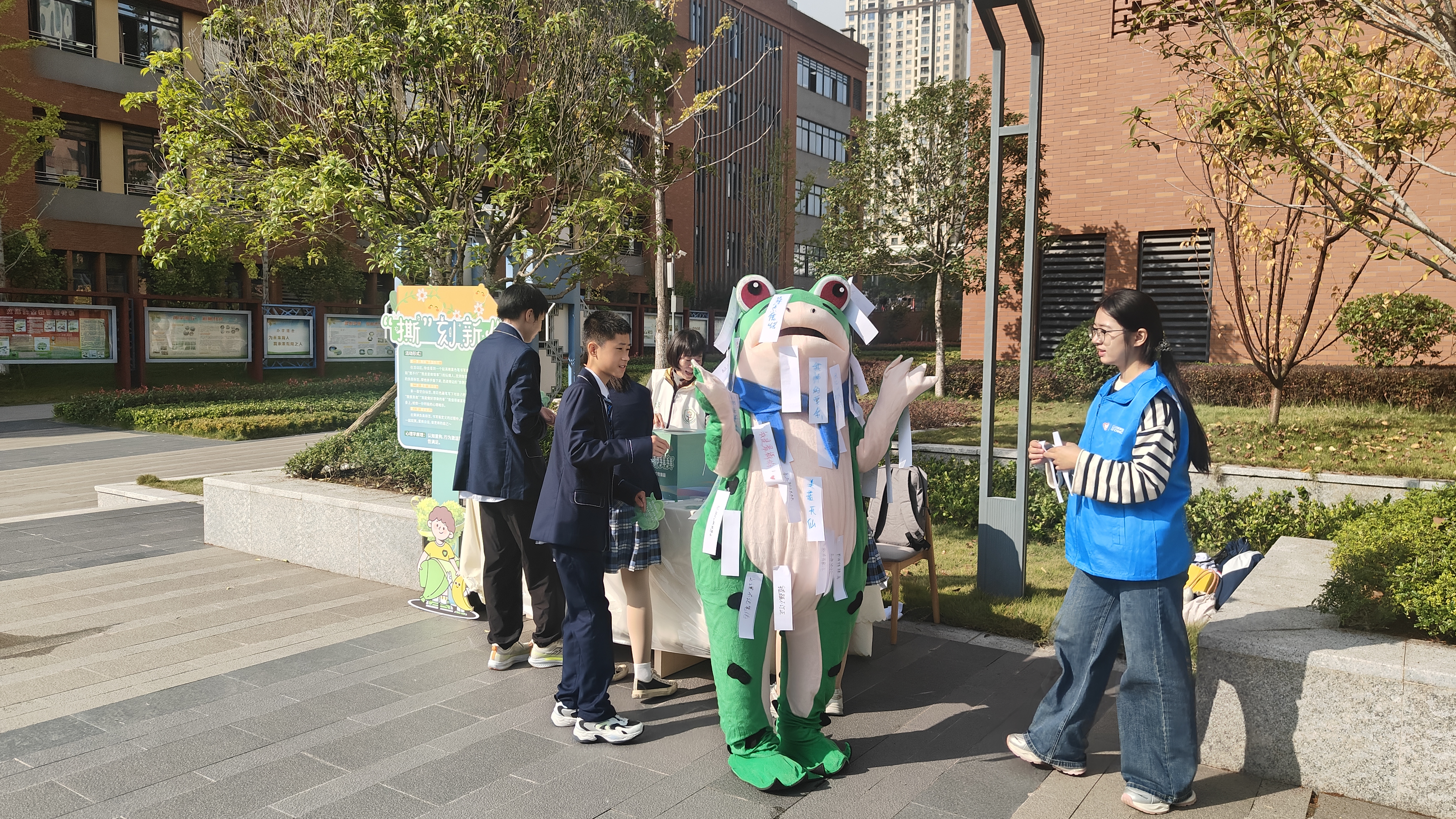 深秋的暖阳洒在重庆七中沙滨学校的操场上,一群学生正围在心理游园区的“压力泡泡纸大作战”摊位前,用力捏破手中的泡泡纸,清脆的声响伴随着阵阵欢笑,仿佛将积压的情绪一一释放。不远处,几名同学专注地绘制着“我的人格面具”,用色彩和线条表达内心的感受。11月4日,由团市委指导,沙坪坝区委、区政府,以及中国人寿保险股份有限公司重庆分公司、广发银行股份有限公司重庆分行联合主办,重庆市沙坪坝区教育委员会、共青团重庆市沙坪坝区委员会、中国人寿保险股份有限公司重庆沙坪坝区支公司、广发银行股份有限公司重庆沙坪坝支行、重庆市12355青少年服务台区域中心站(沙坪坝)、重庆七中沙滨学校共同承办的“沙磁心晴·青葵成长”沙坪坝区心理健康志愿服务进校园启动仪式举行。