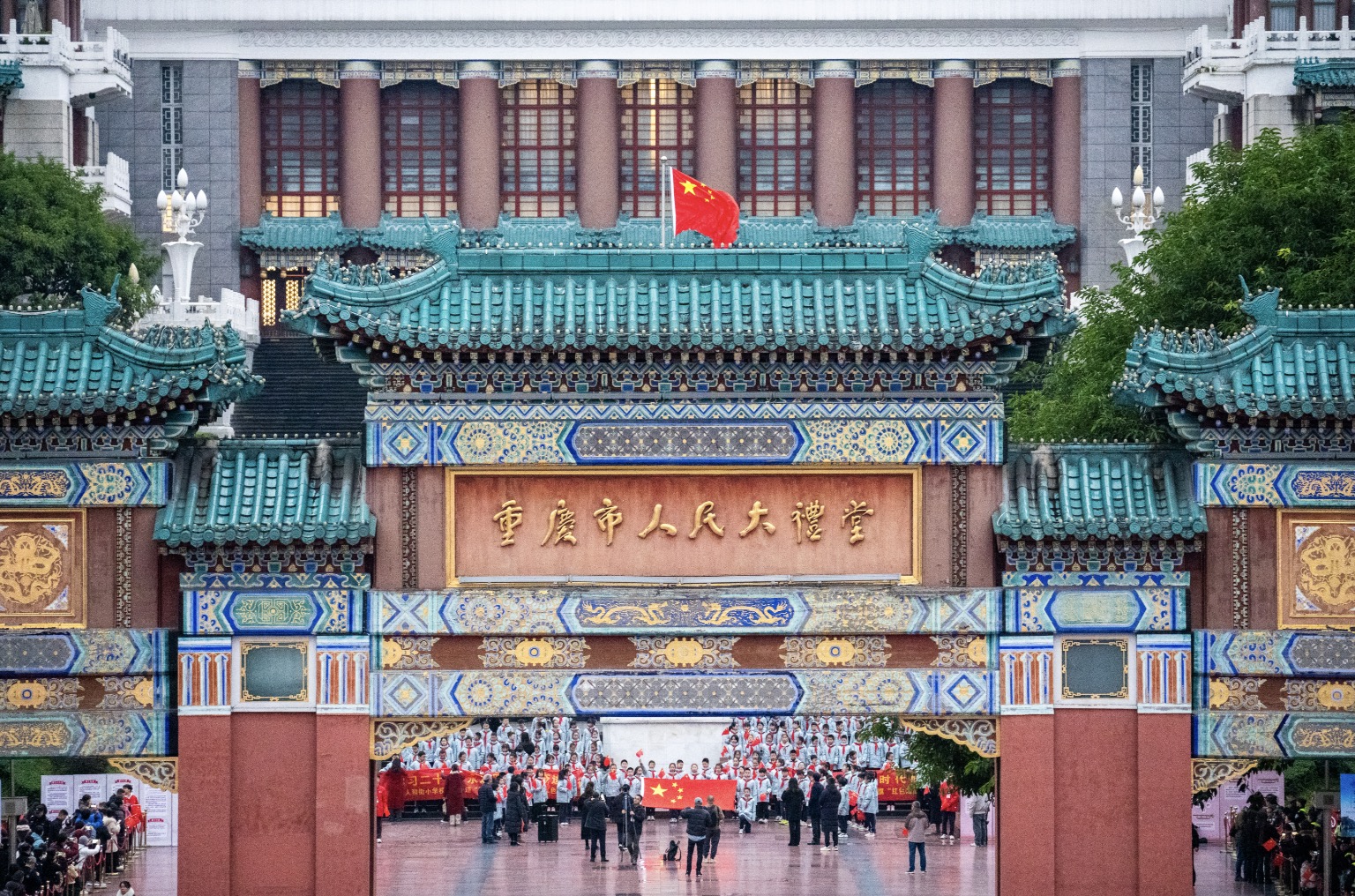 早上7点45分,国旗护卫队在人民广场牌坊下整装集结,灯光下官兵们坚毅的脸庞清晰可见。