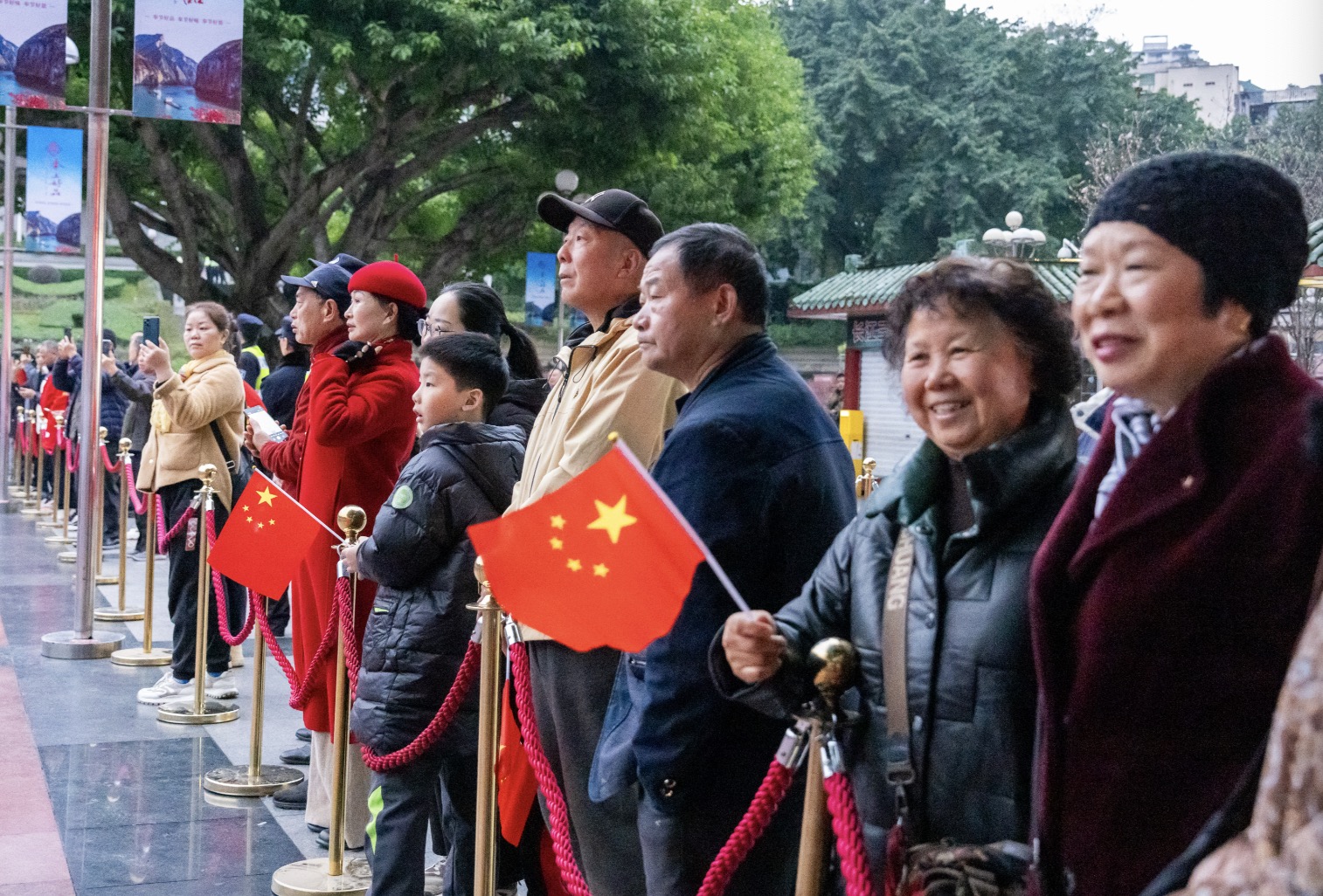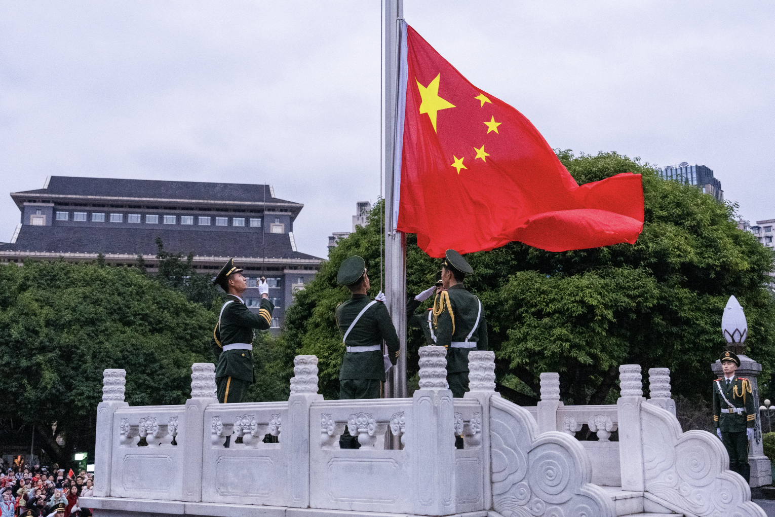 “向国旗——敬礼!”口令声落,擎旗手振臂扬起国旗,雄浑激昂的《义勇军进行曲》响彻广场,现场全体人员庄严肃立,齐声高唱国歌,注视着鲜艳的五星红旗冉冉升起,直至旗杆顶端,迎风飘扬。