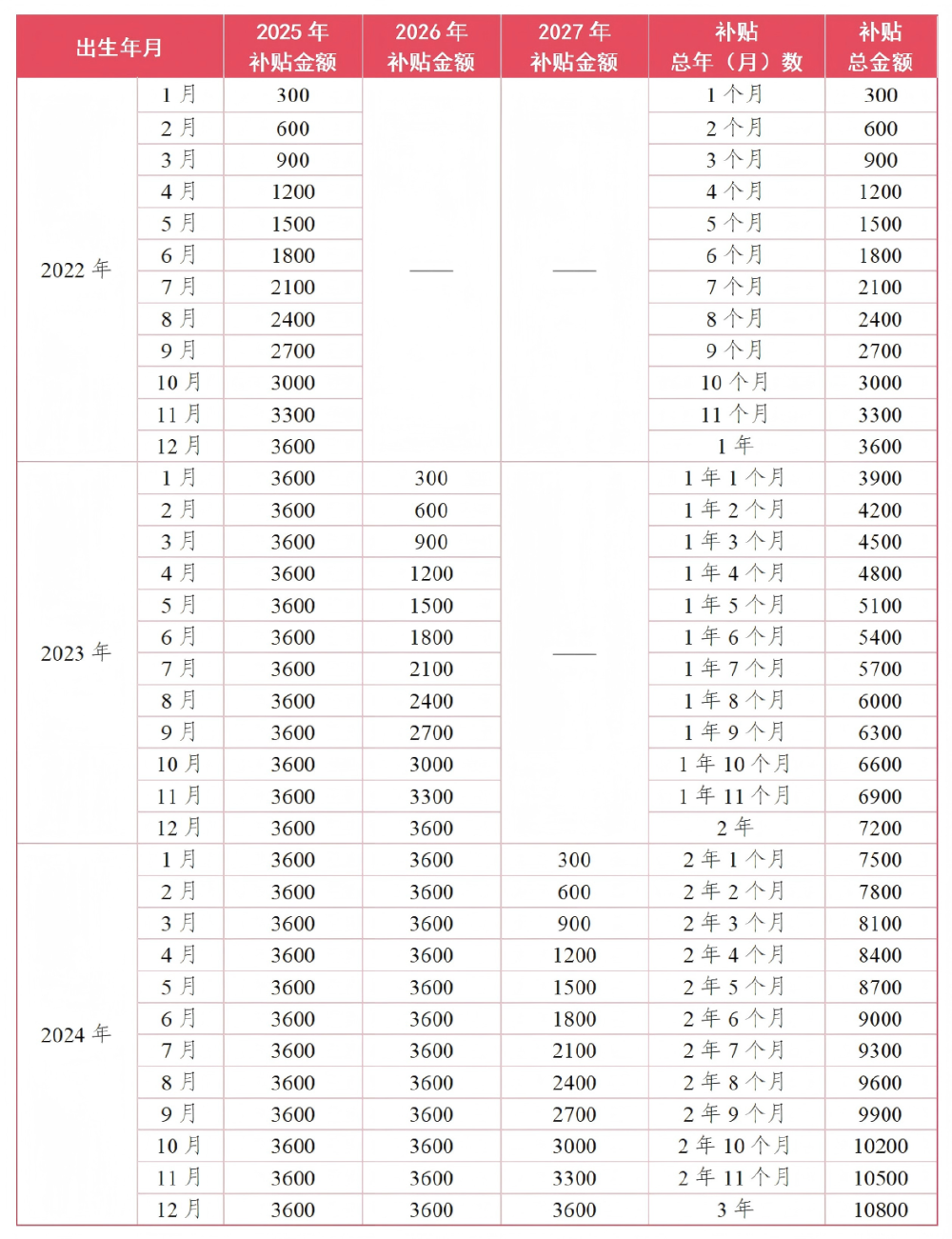 对2025年1月1日及之后出生的婴幼儿,补贴发放至其年满3周岁止。对2025年1月1日之前出生、不满3周岁的婴幼儿,按其未满3周岁的剩余月份数折算计发补贴。具体算法见表。