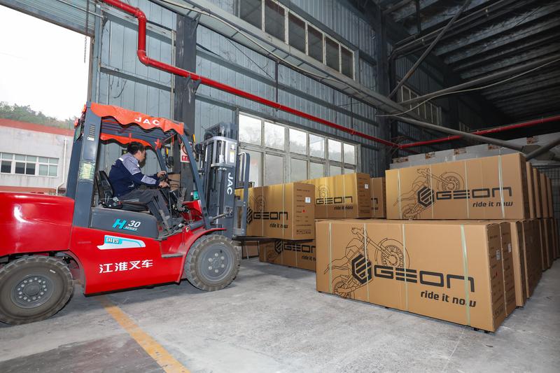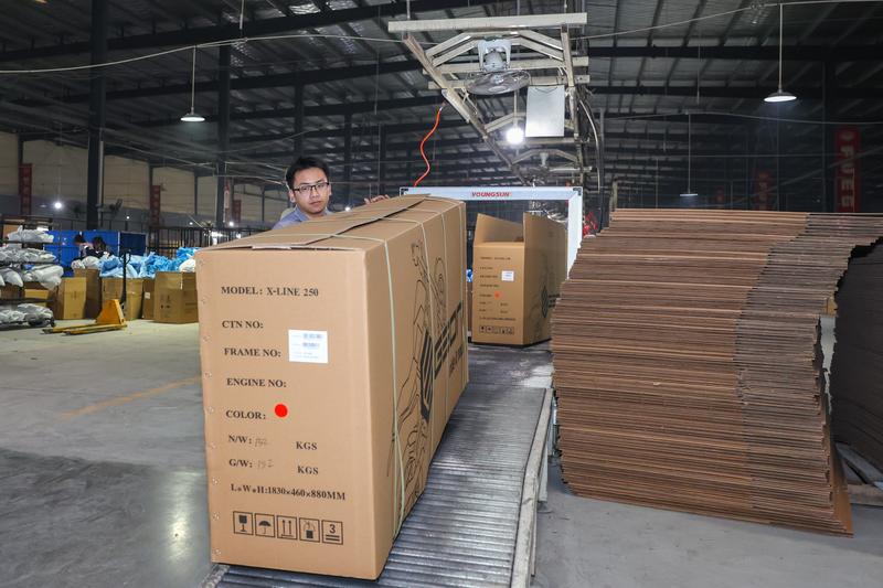 ▲12月2日,在重庆炙焱动力制造有限公司,工人将打包好的摩托车推下包装线。新华社记者 黄伟 摄