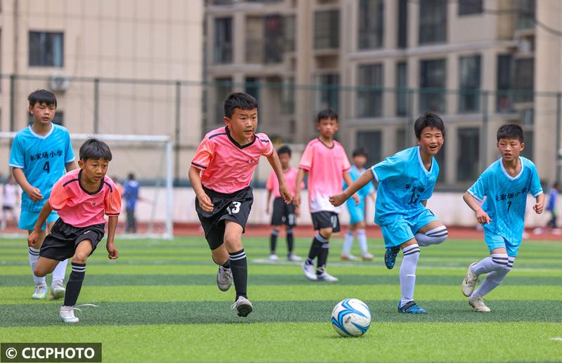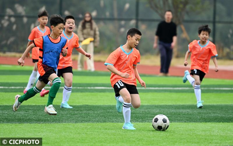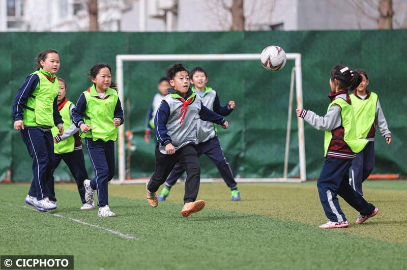 ▲2025年3月27日,山东省荣成市府新小学学生在进行足球比赛。CICPHOTO/李信君 摄