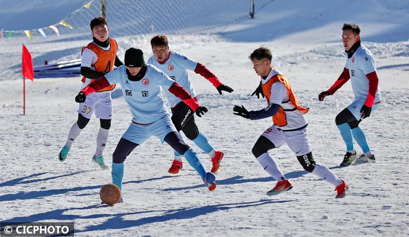 ▲2025年1月8日在位于河北省秦皇岛市海港区石门寨镇的老君顶景区拍摄的河北省第五届冰雪运动会雪地足球比赛现场。CICPHOTO/曹建雄 摄