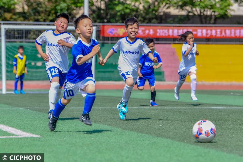 ▲2025年4月15日在贵州省铜仁市玉屏侗族自治县第二小学拍摄的当地小学校园足球联赛比赛现场。CICPHOTO/胡攀学 摄