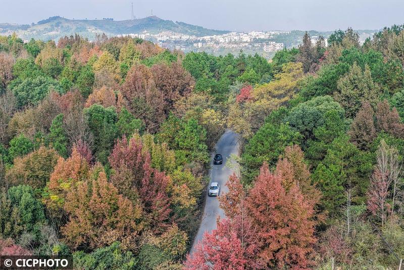 ▲2025年11月30日,在湖南省常宁市三角塘镇长江村,渔罗公路旁的行道树叶色斑斓。CICPHOTO/刘东华 摄