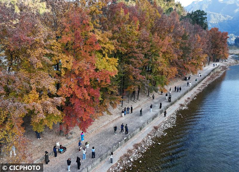 ▲2025年12月6日,人们在浙江省温州市永嘉县鹤盛镇东皋溪边赏叶游玩。(无人机照片)CICPHOTO/蔡宽元 摄