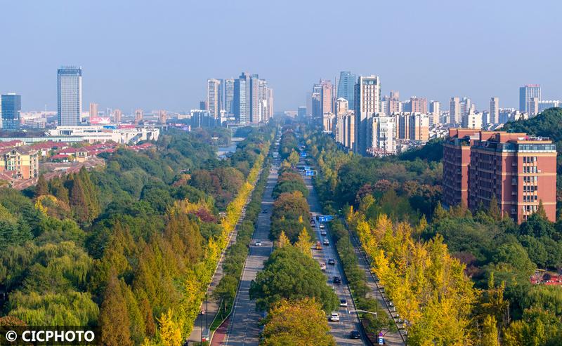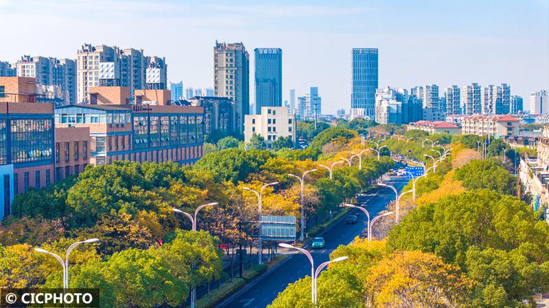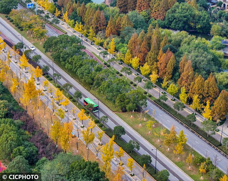 ▲2025年11月26日,浙江省嘉兴市南湖区湘家荡灵湖南路旁的行道树叶色斑斓。CICPHOTO/金鹏 摄