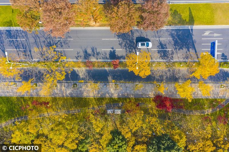 ▲2025年11月29日,浙江省湖州市长兴县龙山大道旁的行道树叶色斑斓。(无人机照片)CICPHOTO/陈海伟 摄