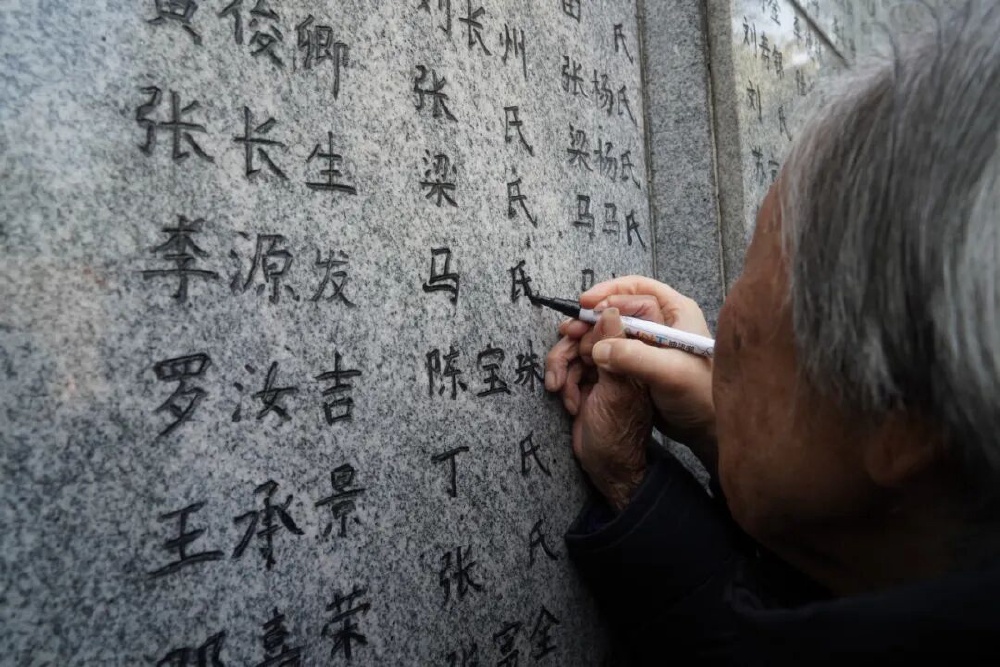 ▲11月30日,南京大屠杀幸存者夏淑琴在“哭墙”上描名。新华社发(刘臻睿 摄)