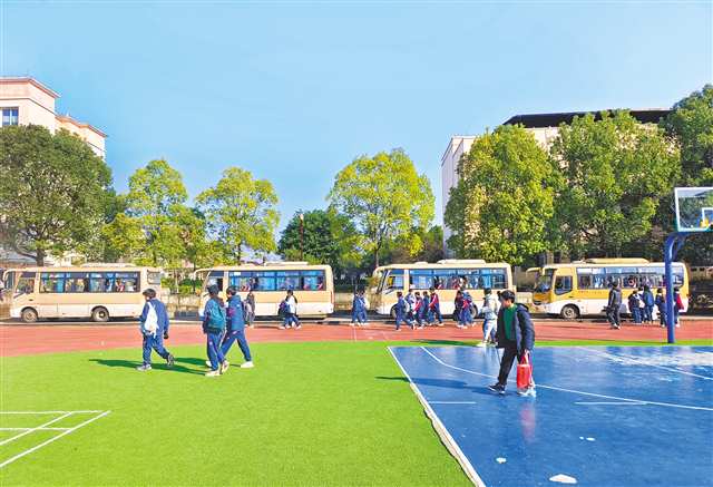 ▲每周五放学时段,礼让镇政府专门调配的7辆公交车开进礼让初中,点对点接送聚奎籍学生回家。受访者供图