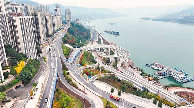 ▲12月30日,万州区重点民生工程——北滨大道延伸段建成通车,长江二桥与驸马长江大桥的北岸滨江道路连通(无人机照片)。通讯员 黄建桦 摄/视觉重庆