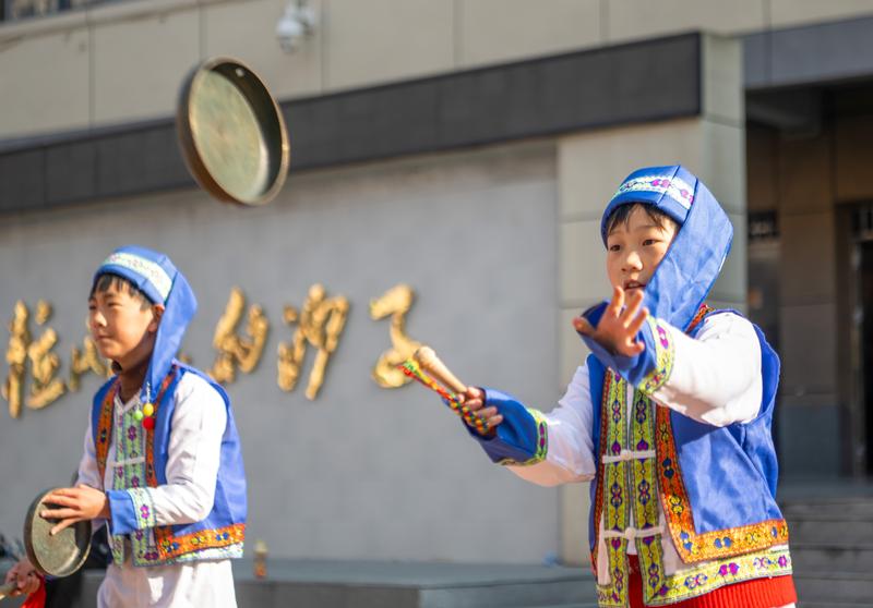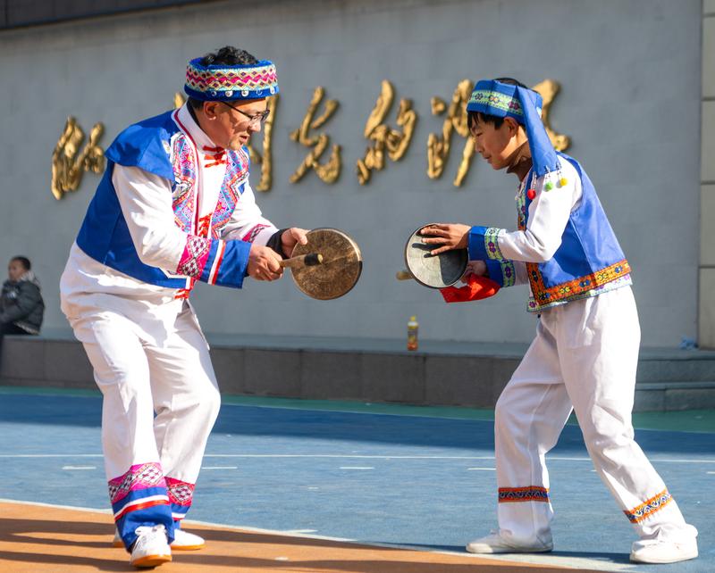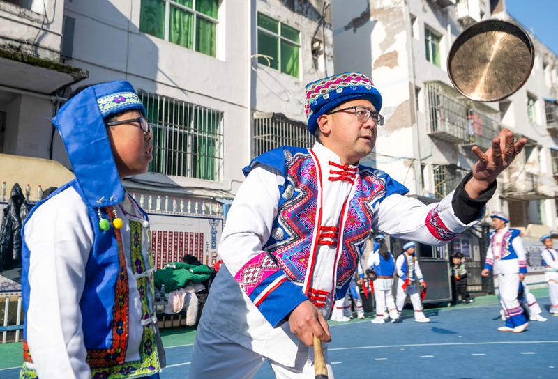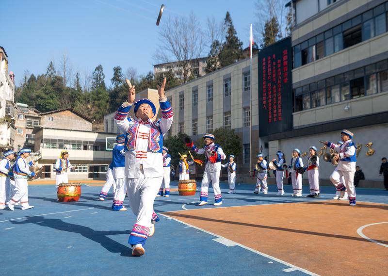 ▲1月9日,非遗代表性传承人在石柱县沙子镇中心小学给学生演示“丢马锣”技艺。新华社记者 唐奕 摄