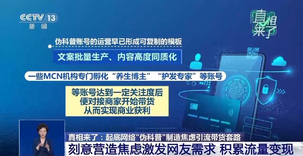 记者调查发现,伪科普账号的运营早已形成可复制的模板,文案批量生产、内容高度同质化。一些MCN机构专门孵化“养生博主”“护发专家”等账号,通过高频发布伪科普内容、刻意营造焦虑积累流量,等账号达到一定关注度后,便对接商家开始带货,从而实现商业获利。