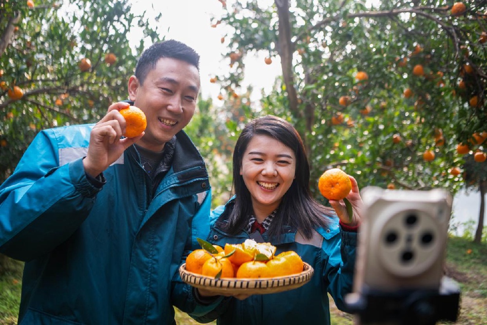 ▲1月15日,工作人员在柑橘林进行直播。新华社记者 唐奕 摄