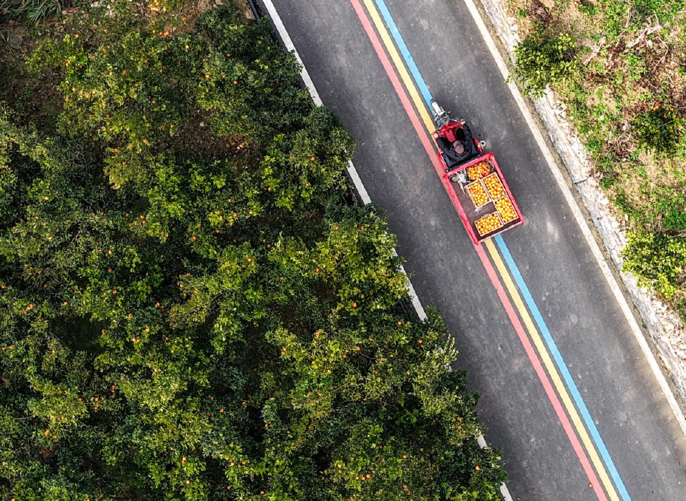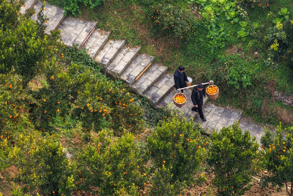 ▲1月15日,果农在转运刚采摘的柑橘(无人机照片)。新华社记者 唐奕 摄