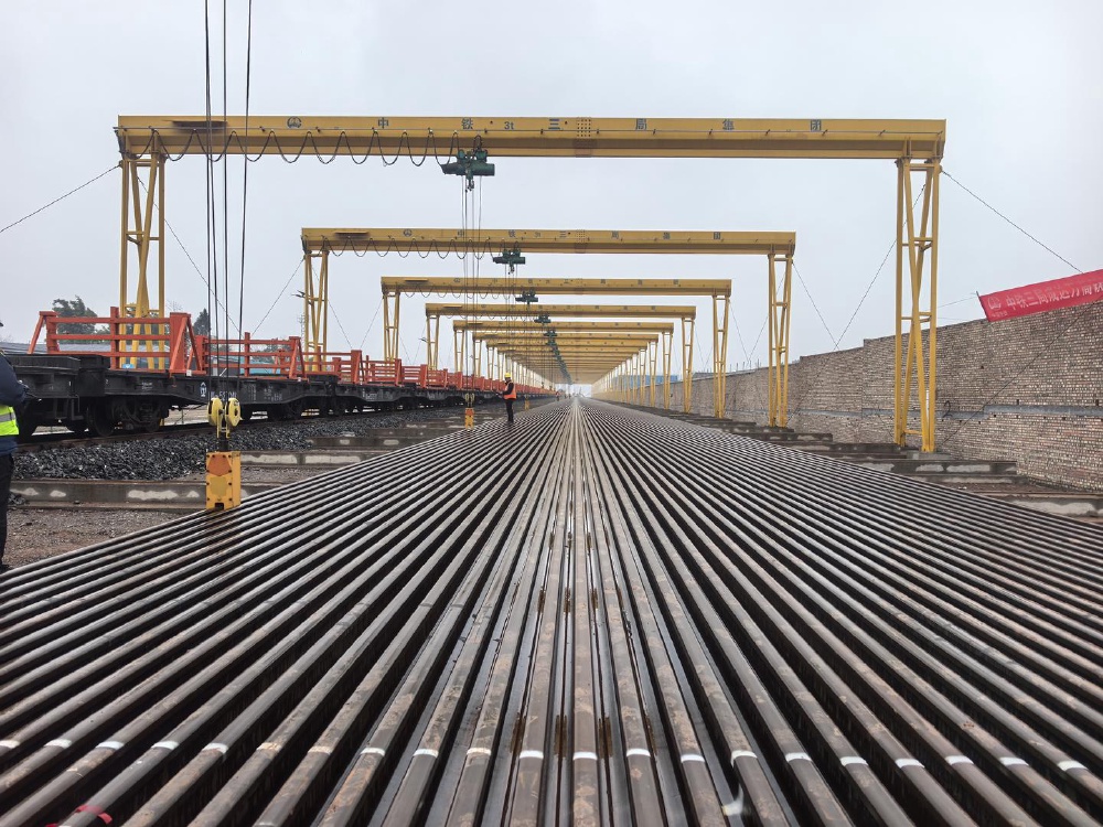 中铁三局成达万高铁铺架分部负责人王志军介绍,成达万高铁南充北铺轨基地占地约5.2万平方米,此次首批到达的500米长轨共计50根,重量达1500吨,可铺设12.5公里线路。钢轨来自数百公里外的石板滩焊轨基地,在完成焊接装车后,经由成都北站、遂宁站、南充西站,到达南充北站后转入铺轨基地。500米长轨相比传统短轨,能大幅减少线路接头,提升列车运行平稳性和安全性,但对运输、装卸和后续铺设都提出了极高要求。