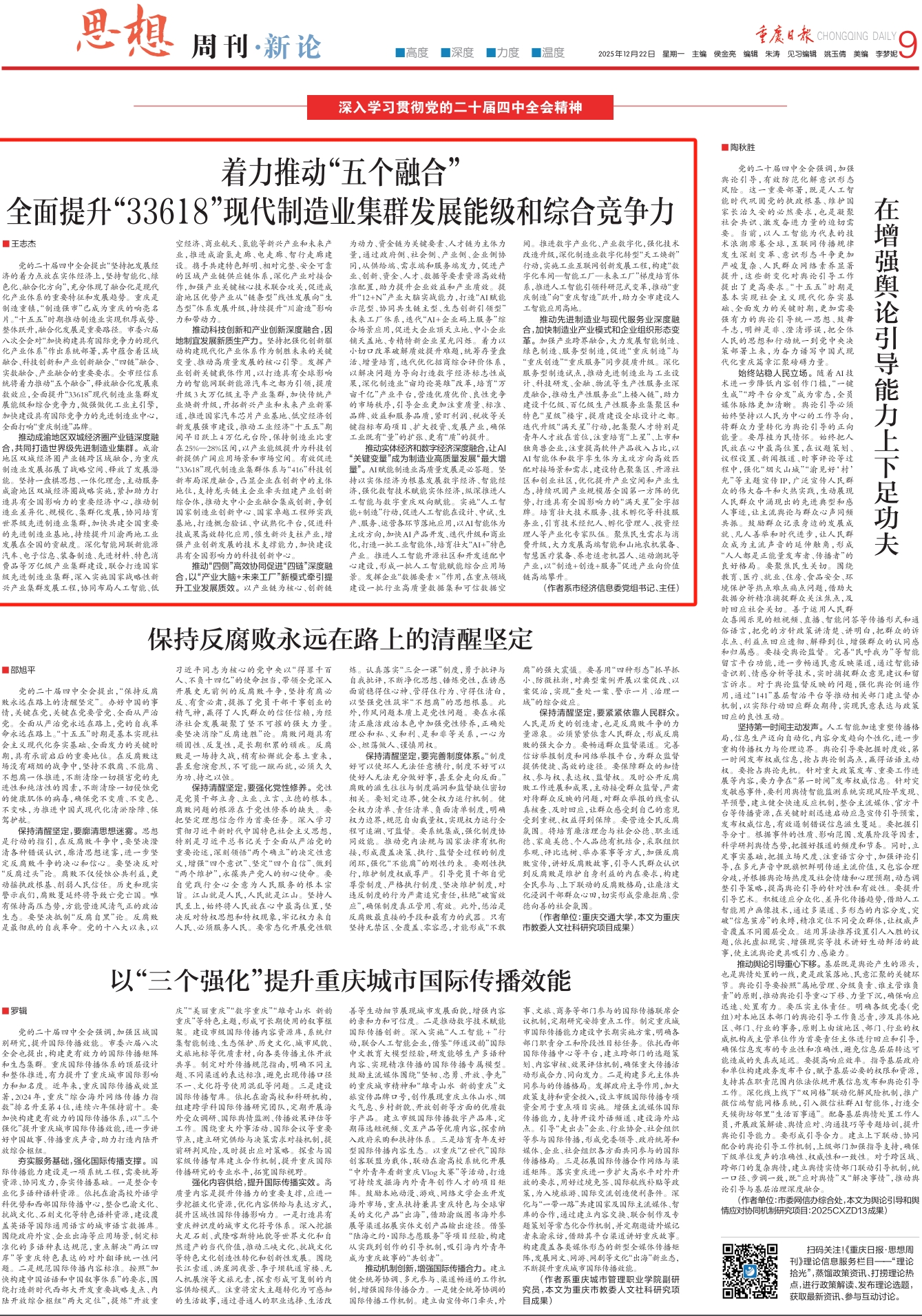 党的二十届四中全会提出“坚持把发展经济的着力点放在实体经济上,坚持智能化、绿色化、融合化方向”,充分体现了融合化是现代化产业体系的重要特征和发展趋势。12月22日,市经济信息委党组书记、主任王志杰在重庆日报思想周刊发表了题为《着力推动“五个融合” 全面提升“33618”现代制造业集群发展能级和综合竞争力》的理论文章。文章从推动成渝地区双城经济圈产业链深度融合、推动科技创新和产业创新深度融合、推动“四侧”高效协同促进“四链”深度融合、推动实体经济和数字经济深度融合、推动先进制造业与现代服务业深度融合五个方面着手,充分释放融合化发展乘数效应,全面提升“33618”现代制造业集群发展能级和综合竞争力,做强做优工业主引擎,加快建设具有国际竞争力的先进制造业中心,全面打响“重庆制造”品牌。