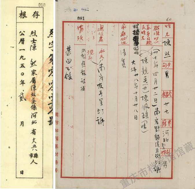 《一一·二七蒙难烈士登记簿》陈然登记页及烈士证家属存根。(重庆市档案馆馆藏)