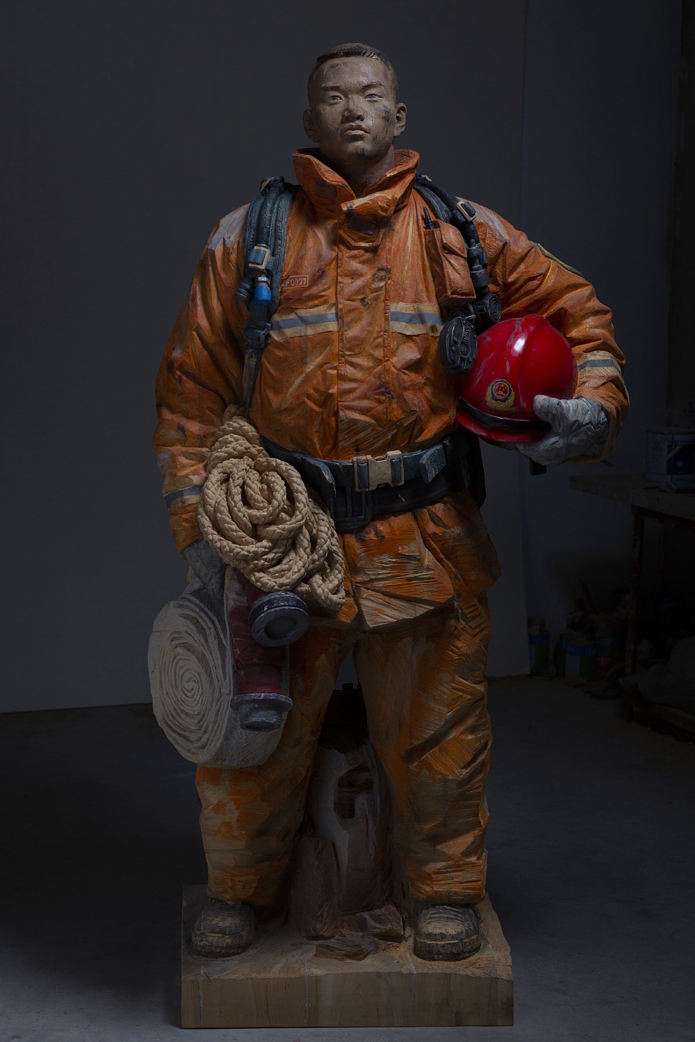 于是,我找了一位年轻挺拔的消防员作为创作原型,寸头、方脸、单眼皮,平静而笃定的眼神,抿得紧紧的嘴唇,粗壮结实的脖子……他将英武的气概与大男孩的生涩、崇高的职责与飞扬的青春融为一体。