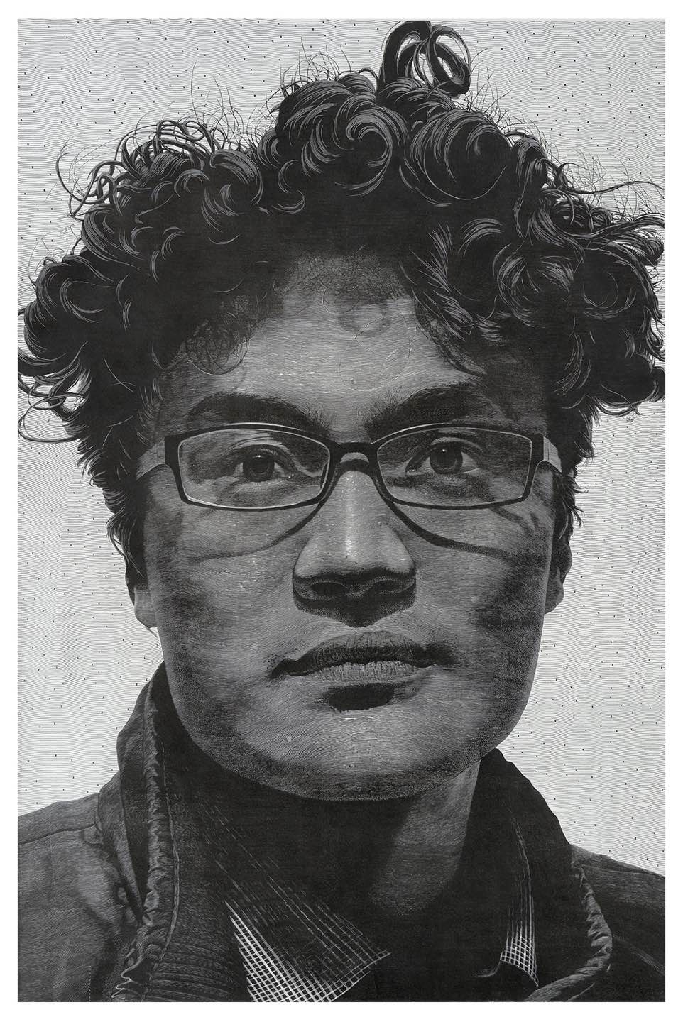 作品中,我用超大的青年人物肖像和木刻艺术细微的刀痕,塑造了当代青年励志奋斗、阳光自信的形象,并较好地体现了传统木口木刻的当代图像转换。